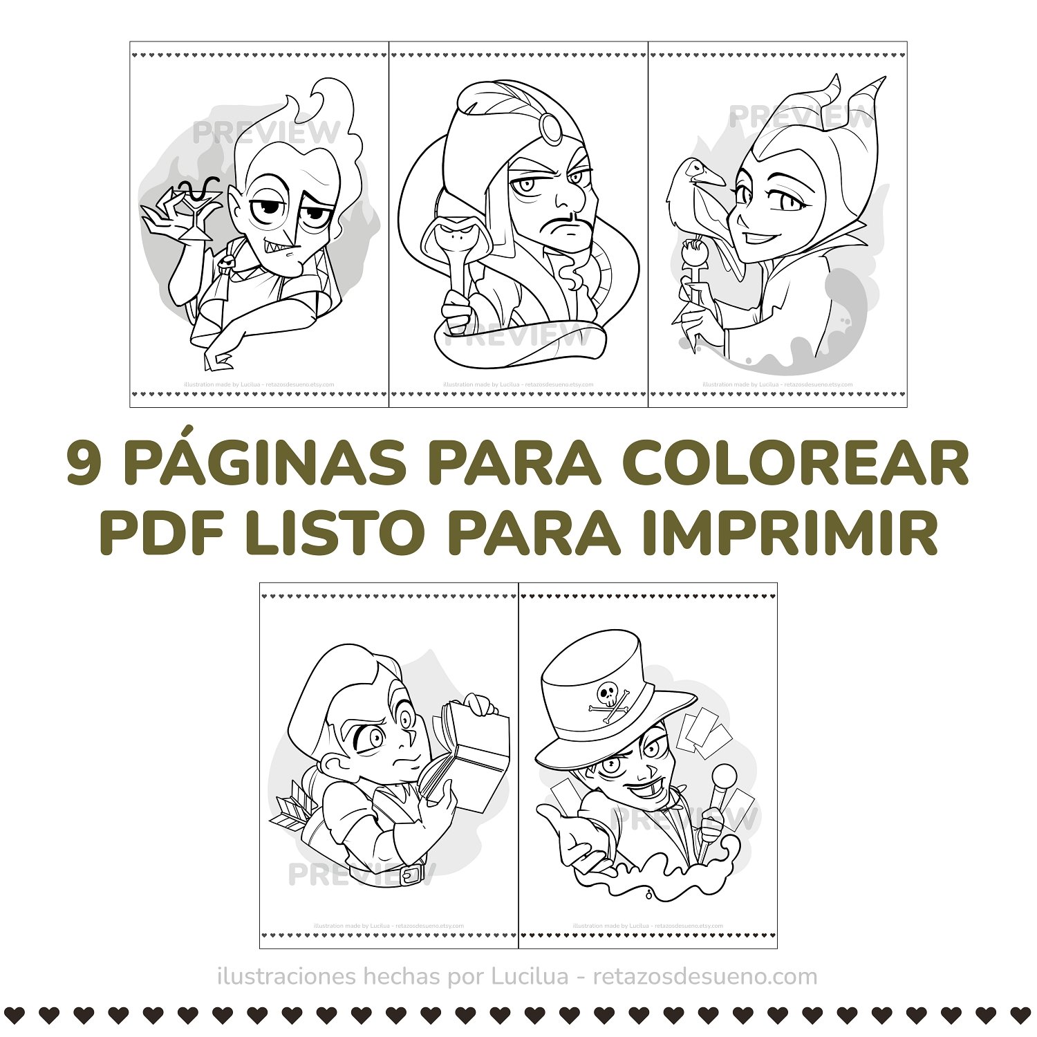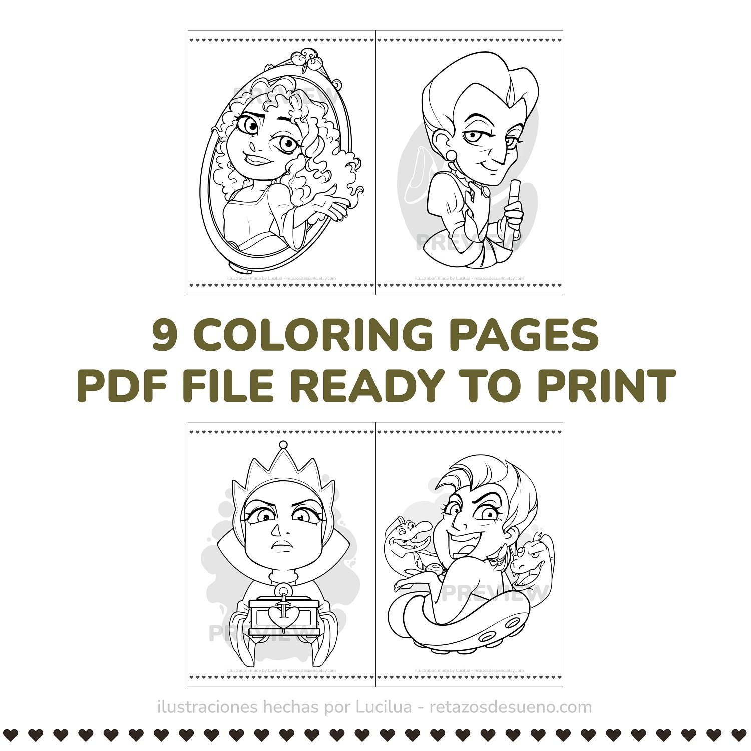 Colorea a Maléfica Úrsula Hades Jafar Gaston Dr Facilier Madre Gothel Madrastra de Blancanieves y La Reina Malvada ¡Diviértete coloreando a los villanos de tus películas de animación favoritas! Descargarás un archivo pdf con las páginas para colorear. ¡Listo para imprimir! Echa un vistazo al resto de paginas para colorear de más personajes disponibles en mi tienda, como princesas, príncipes y villanos.